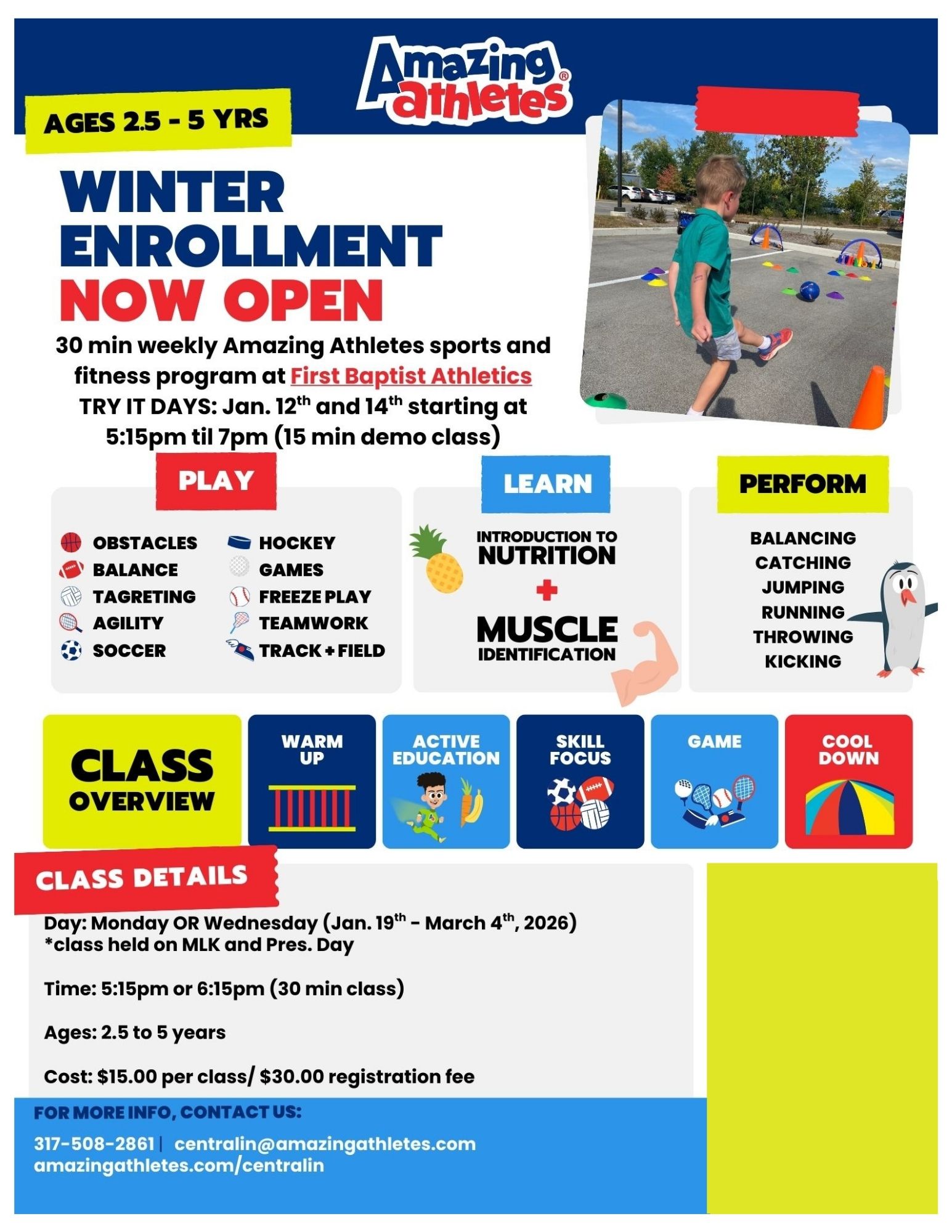 Amazing Athletes is coming to FBA this winter with fun, active classes for ages 2.5โ5. A great way for our youngest kids to move, play, and build early sports skills.
